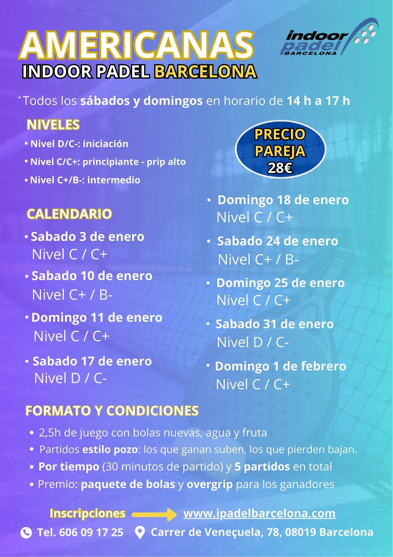 AMERICANAS SABADO Y DOMINGO ENERO 2026 Indoor Padel Barcelona25/12/202502/02/2026 31/01/2026 Cerrada